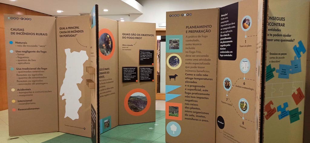 Nowadays, rural fires are one of the major environmental problems, endangering natural rural areas, people and their property. However, fire is an integral part of our lives and is actually indispensable for the well being of everyone. In Portugal, fires are a common occurrence, as is natural in the Mediterranean region that features wet winters and dry summers. Very dry years, with heatwaves and high winds, can lead to catastrophic events like in the years of 2003, 2005 and 2017. It is therefore indispensable to take preventive measures. Traditional fires (agricultural burning and intentional farm fires) as well as controlled fires help prevention efforts by reducing the vegetation and creating patchworks in the countryside (breaks in the vegetation). Fogo Frio (Cold Fire) is an exhibition-game for children, youths and adults about PREVENTION.